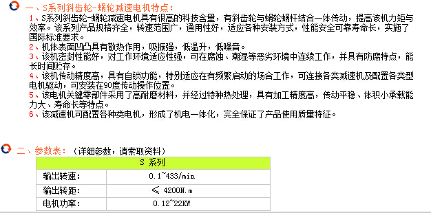 1、S系列斜齒輪-蝸輪減速電機具有很高的科技含量,有斜齒輪與蝸輪蝸桿結合一體傳動,提高該機力矩與效率。該系列產品規格齊全,轉速范圍廣,通用性好,適應各種安裝方式,性能安全可靠壽命長,實施了國際標準要求。"